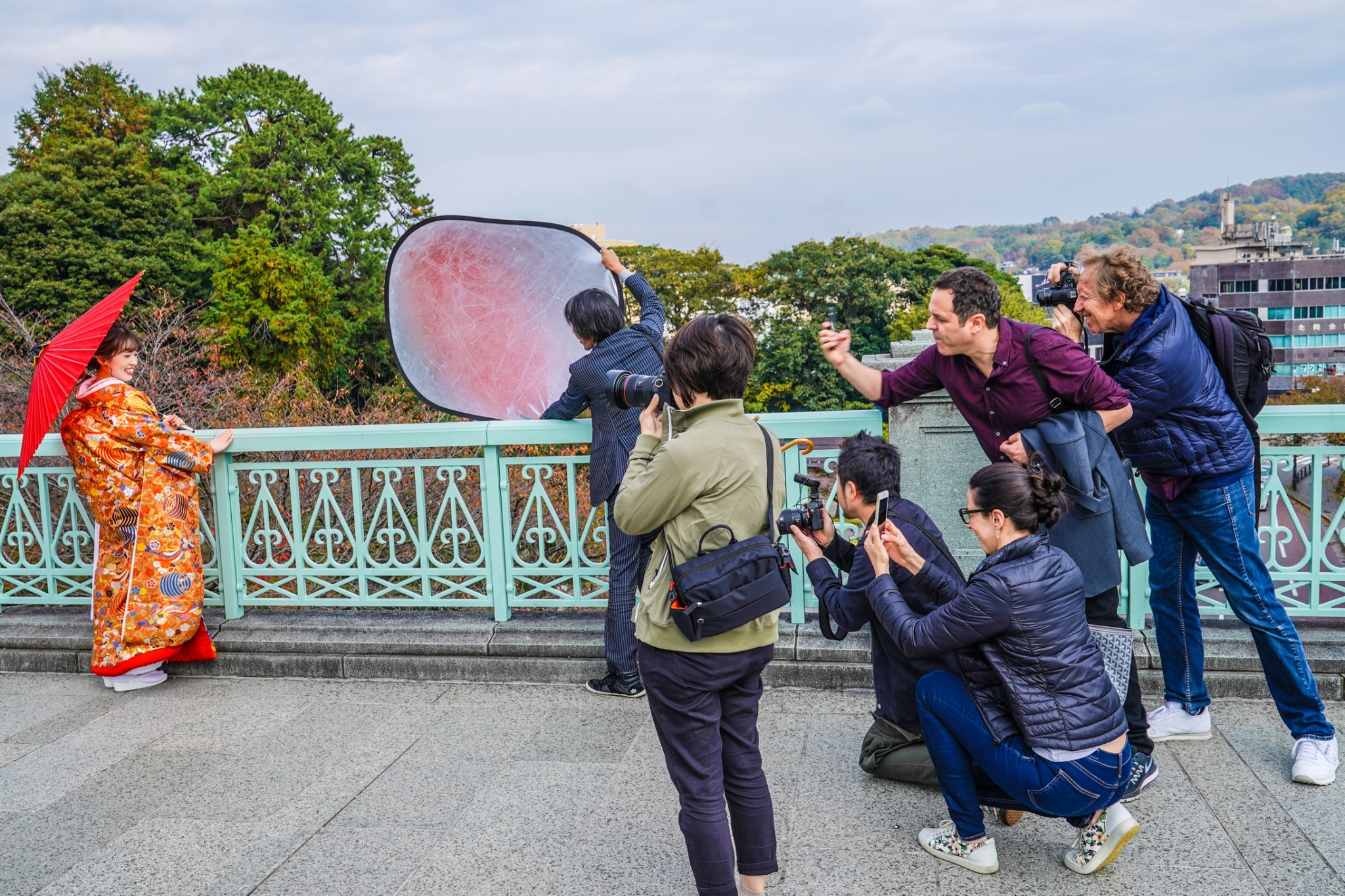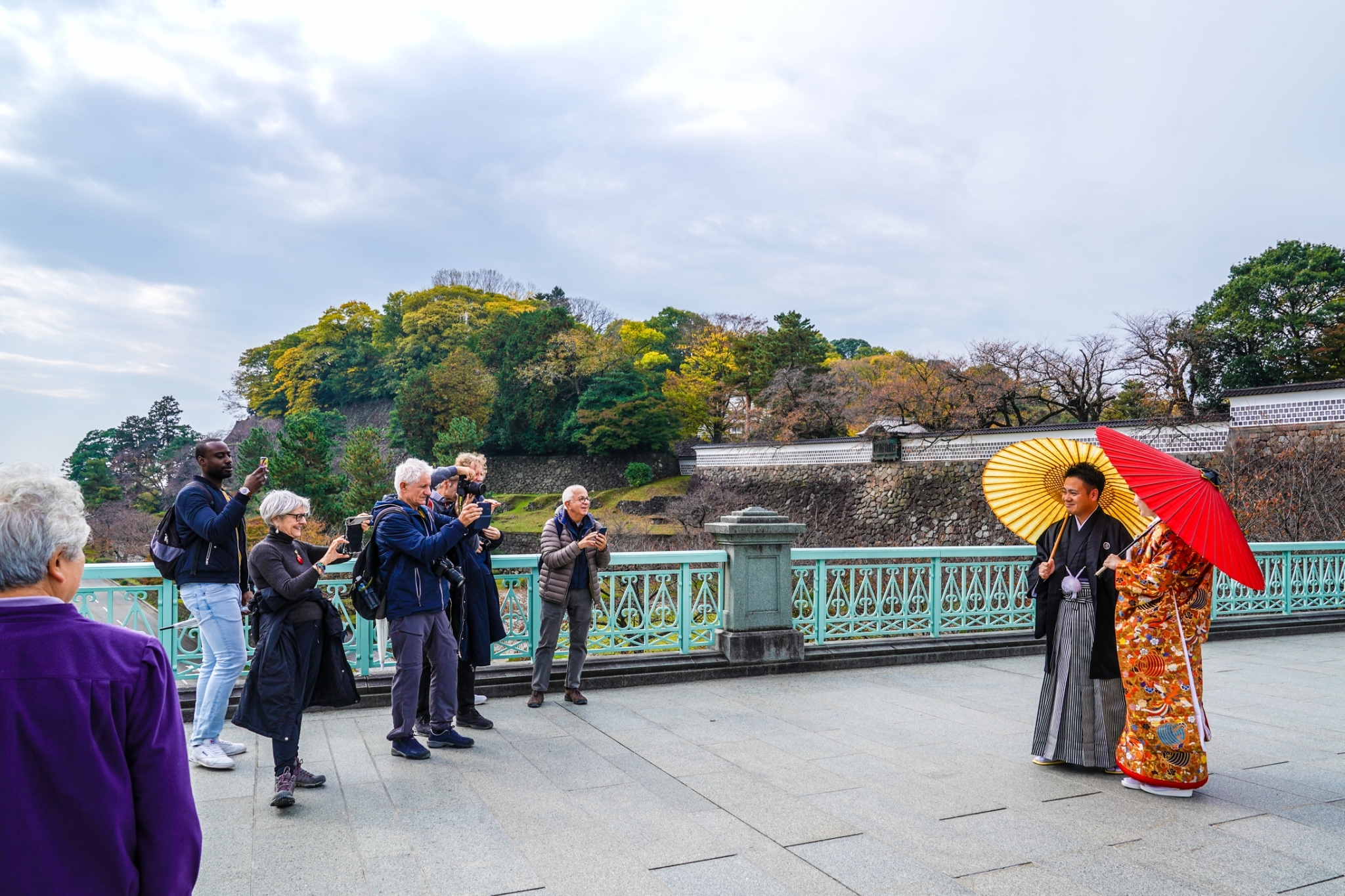 実際に11月にロケーション撮影をした方は、金沢城・兼六園で前撮り撮影された新郎新婦様がいらっしゃいます。雨の多い秋のシーズンで、その前撮り撮影日も雨予報でした。朝から雨の降る中、ロケーション撮影を諦めて、スタジオ内での撮影も考えながら、雨の上がるタイミングを見ていました。一瞬、雨が止んだ隙を狙って、ロケーション撮影を決行!和装の衣装での撮影を望まれた新郎新婦様は、スタッフのサポートも得ながら、動きが自由にいかない色打掛で一生懸命、撮影に挑んでいただきました。和装での前撮り撮影は、落ち着いた兼六園の雰囲気の中で、華やかな情景を創りだします。お二人の撮影の様子はとても美しく、兼六園に訪れた外国人観光客もその美しさに見とれていて、とても興味津々。気づいたときには、お二人は、前撮り撮影隊ではなく、多くの外国人観光客に囲まれながら進める撮影となりました・・・笑。